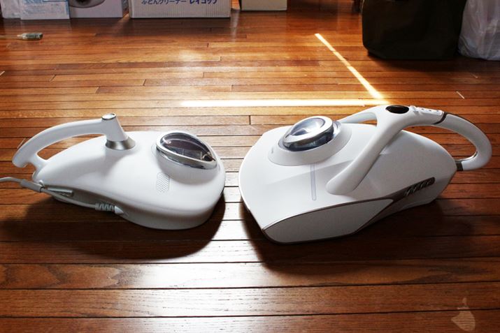 布団に重曹を撒き、レイコップRN(左)とレイコップRX (右)をそれぞれ1往復して除去具合を確認します