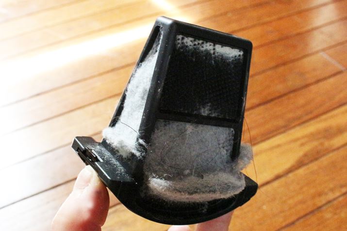 本来は、ダストカップ内のゴミが再飛散しないように水に浸して捨てるのですが、今回は撮影のため濡らさずに取り出してみました。黒色のフィルターが真っ白になるほど、微細じんがぎっしり付いています。ゴミを出した瞬間にくしゃみが止まらなくなったので、このゴミはアレル物質の塊であることは間違いありません!