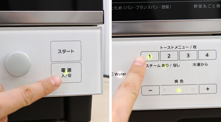 電源を入れたら、タッチパネルでパンの枚数やスチームのあり/なし、3段階から選べる焼き具合などを選択して、加熱スタート! 初期状態ではスチームありに設定されているため、「Water」ランプが点灯します