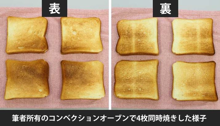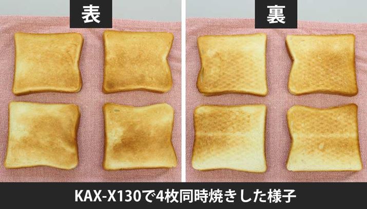 KAX-X130は、コンベクション機能のおかげで、複数枚のパンもムラなく同時トーストできるというのが売りのひとつ。そこで今回は、パンを4枚同時にトーストした場合の焼きムラを、筆者所有のコンベクションオーブンと比較してみました。結果、KAX-X130のほうが焼きムラが抑えられています。