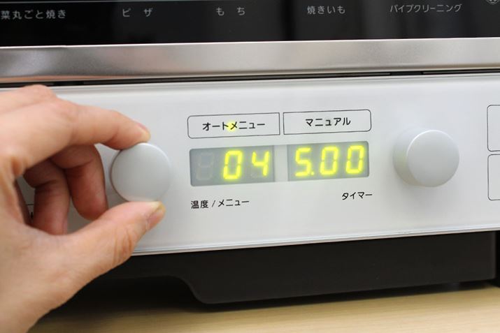 オートメニューを使用する際は、つまみを回してナンバー数で指定します。どの調理メニューがどのナンバーに該当するのか、付属のレシピを見ないとわからないので、そこだけ少々手間かもしれません。ちなみに、パンの温め直しは「3」と「4」