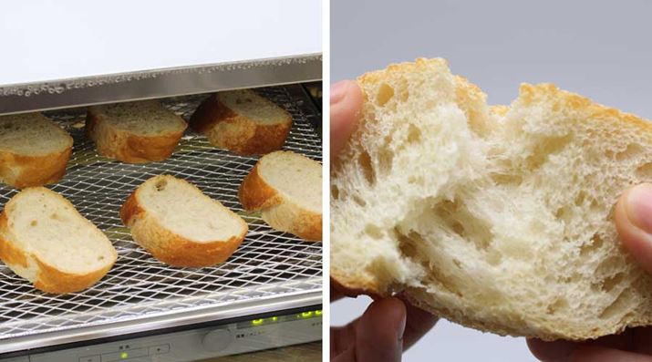 フランスパンはかなりイケてる仕上がり。厚み3〜4cmにカットしたものを6切れセットしてみましたが、どれも焦げ付くことなくムラなく温まりました。ミミはカリッと、中身はふっくら仕上がって、レストランで出てくるみたい!