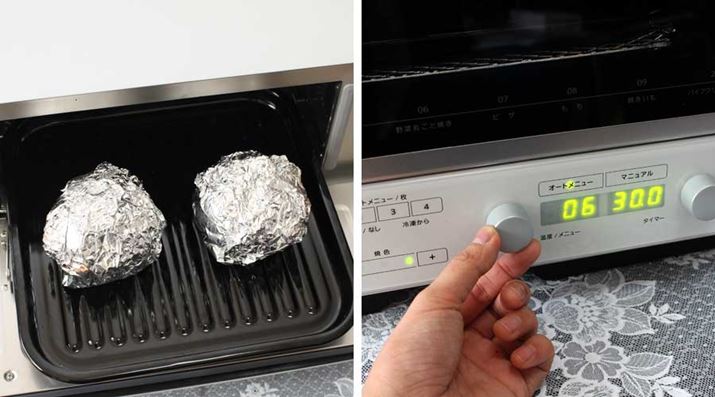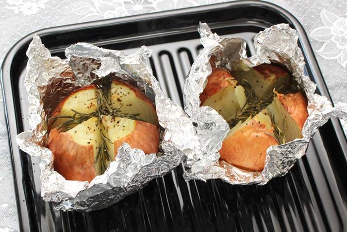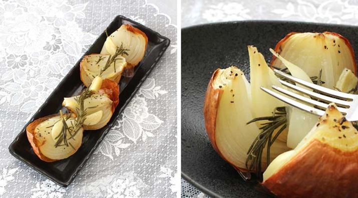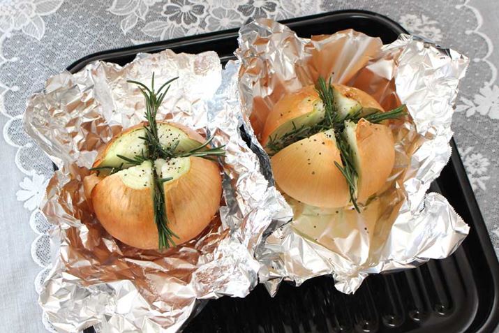 皮付きのたまねぎに十字の切り込みを入れ、ローズマリー、タイム、にんにくをはさみ、オリーブオイルをかけて塩コショウをふりかければ準備OK。オートメニュー6「焼色・強(30分)」で加熱スタートします