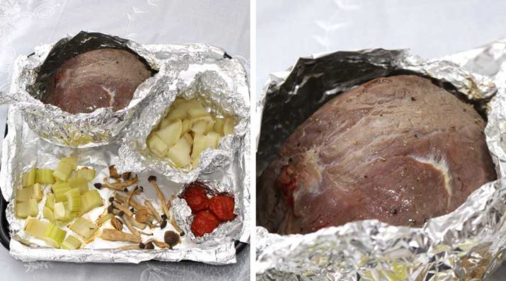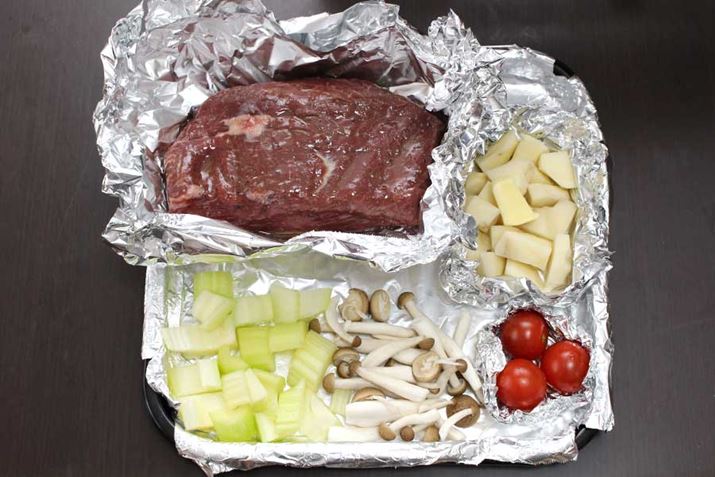準備としては、牛モモ肉に塩コショウとにんにくオイルをなじませて、アルミホイルに包むだけ。付け合せの野菜も一緒にローストできるので便利です。オートメニュー「11」で焼色・強(20分)に設定して加熱スタート
