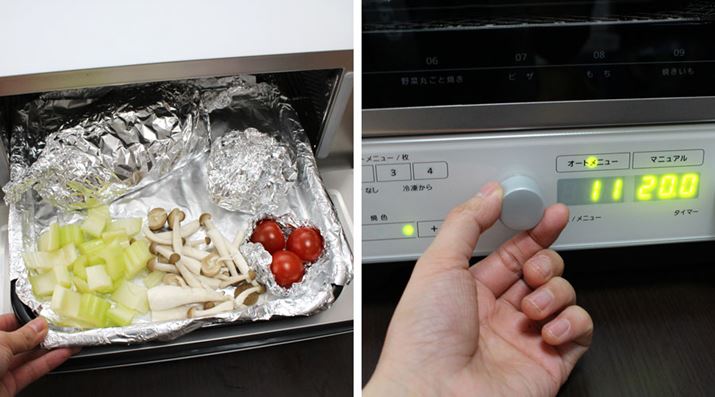 いよいよここからは、調理機能を試していきましょう! KAX-X130の付属レシピでもイチオシされているのが、オートメニュー「6」の「野菜丸ごと焼き」。好きな野菜に調味料をかけて加熱すれば、野菜の栄養とうま味を丸ごと味わえるというヘルシーなモードです。KAX-X130でただ焼くだけで、野菜がおしゃれなごちそうになりました。