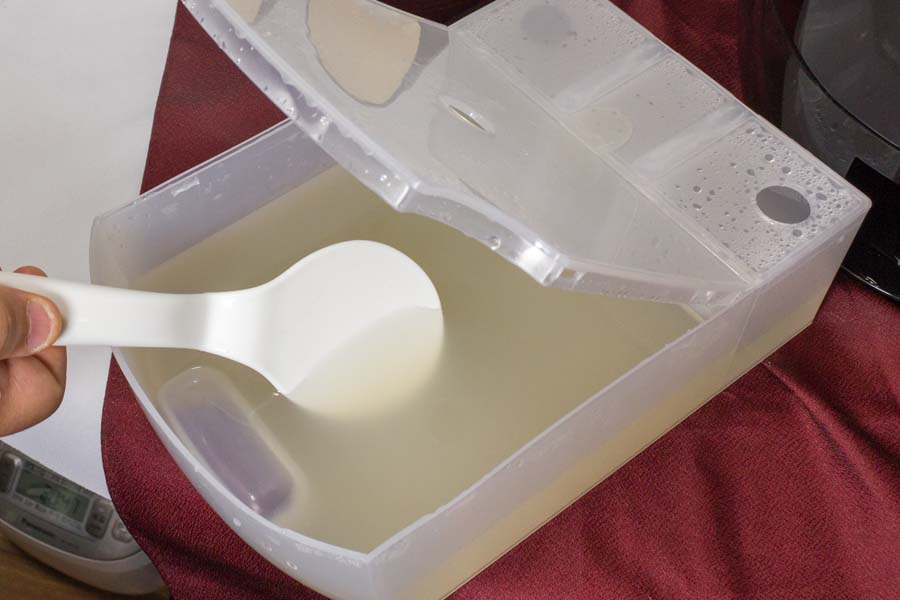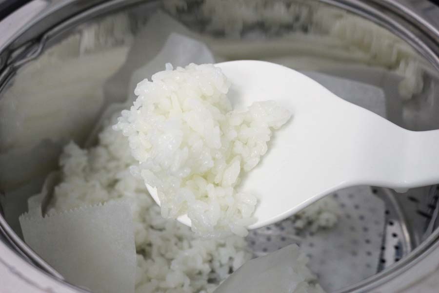 蒸し料理と同様に外釜、内釜をセットし、1合分を温めてみます。あたためる前はしゃもじも入らないくらいカチカチ