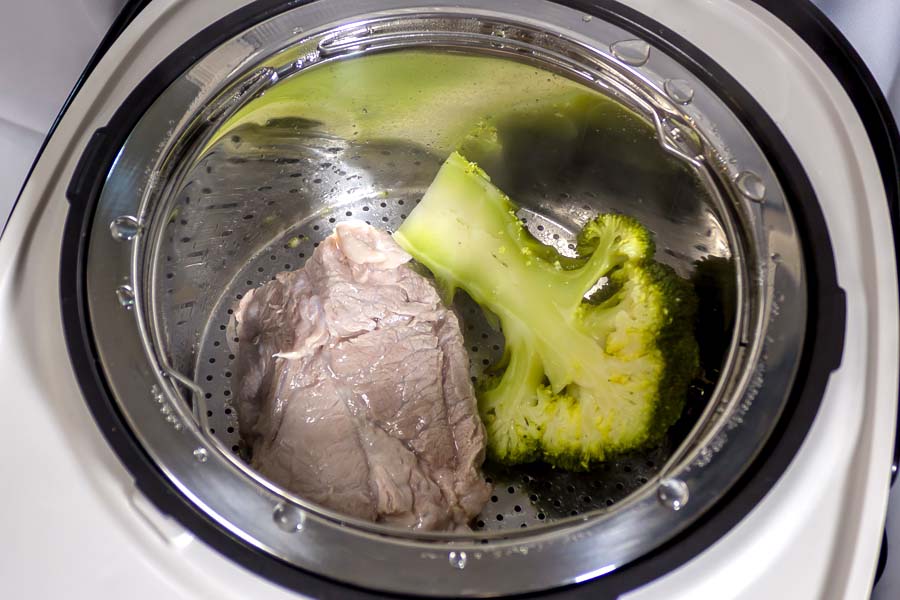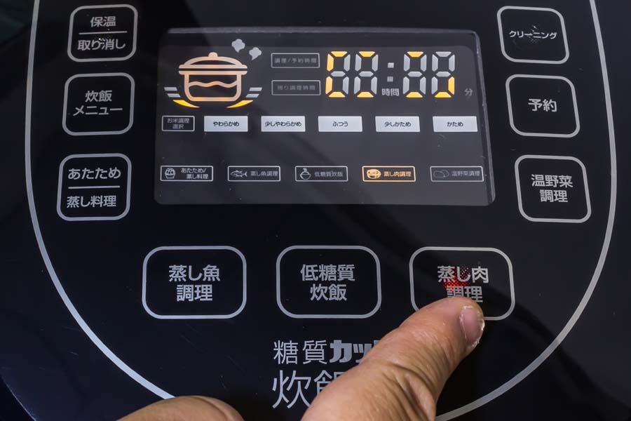 蒸し調理も、材料と水を入れた後にそれぞれ対応するボタンを押すだけ。蒸し魚、蒸し肉、温野菜は、それぞれ蒸し時間が約8、20、25分となっています。今回は肉の調理をメインに考えているので、「蒸し肉調理」モードを使用