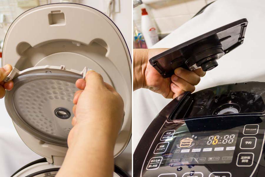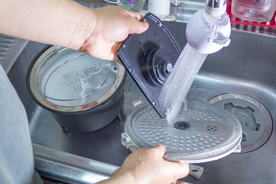 糖質カット炊飯器には、「クリーンモード」という内部を清掃する機能が搭載されています。クリーンモードを作動させてみると、「カンカン」という音と、「サー」と水が流れる音がし、排水タンクに水が出て、あっという間に終了。どうやら、水を吸い上げて給水する部分を清掃しているだけのようです。内ぶたや蒸気口ふたなどは外して水洗いができるので、一般的な炊飯器と同じ感覚でお手入れできます。