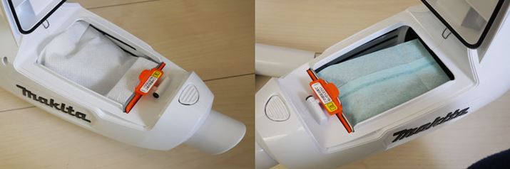 紙パックは、ゴミがたまったら丸ごと捨てるだけなので、お手入れいらず。ただし、容量が330mlとそれほど大きくないため、メインの掃除機として使っていると結構な頻度で交換する必要があります。価格.comでの紙パック(10枚入り)の最安価格は427円(税込、2018年2月20日時点)となっており、コストパフォーマンスだけを考えるとダストバッグのほうがお得。コストがかかってもお手入れが面倒だという人は、紙パックを定期的に買うのがよいでしょう。紙パックを使う場合の難点は、マキタ純正の紙パックしか使えず、安価な代用品を使えない点でしょうか。
