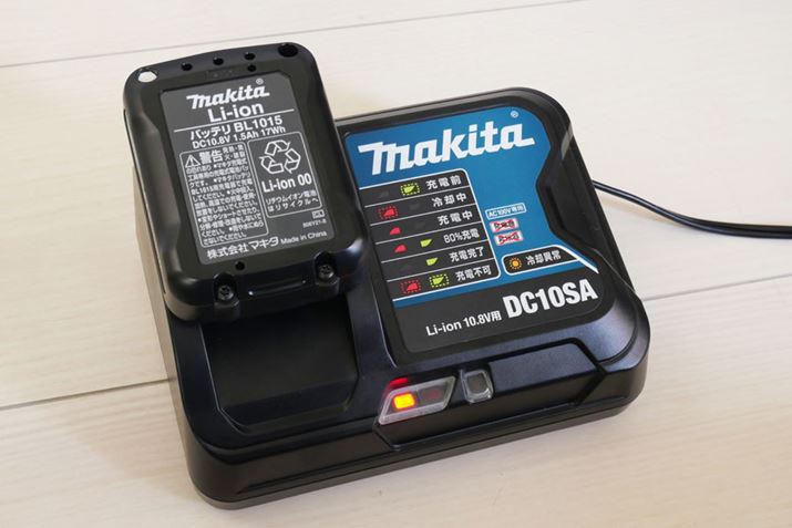 使用前にはバッテリーの充電が必要。充電器は、マキタの電動工具に付いているものと同様のデザインです。満充電には実測で約25分かかりました