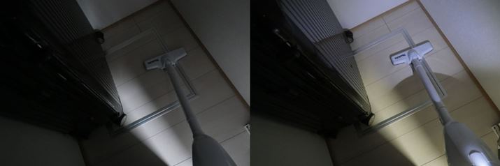 本体にはLEDライトが搭載されているため、暗いクローゼットでもきれいになったか確認しながら掃除可能です(左がLEDオフ、右がLEDオン)