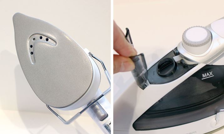 かけ面はフッ素樹脂製。先端の先細りチップにより、アイロンとしての使用時には襟元やボタン周りもかけやすくなっています(写真左)。水タンクの容量は最大50mL(写真右。取り外しは不可)