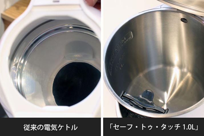内部につぎ目がないフラットな作りになっているのもポイント。従来の電気ケトルのように内部に段差やつぎ目がないので、洗いやすくなっています