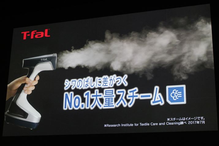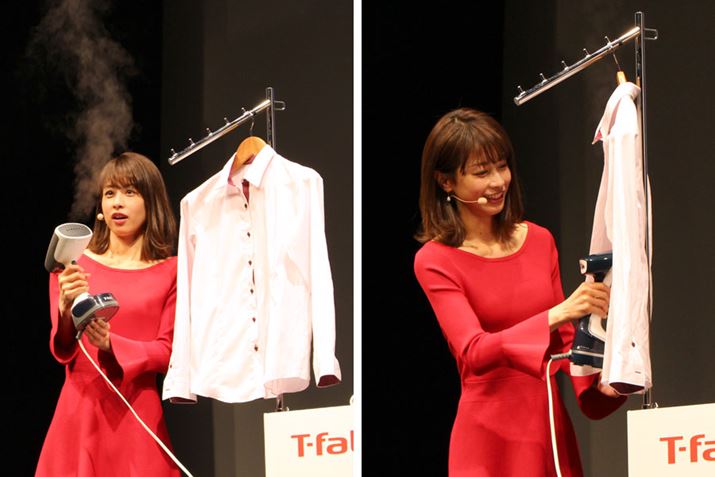 グループ・セブが開催した新製品発表会には、フリーアナウンサーの加藤綾子さんが登場。コンパクトな「アクセススチーム ライト」から大量に噴射されるスチームに加藤さんもおどろき!