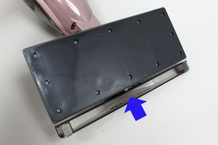 ヘッドの裏には、一般的な掃除機にある回転ブラシなどはありません。この黒いパーツの部分にワイパーシートを装着することで拭き掃除し、黒いパーツの前にあるノズルからゴミを吸い込みます