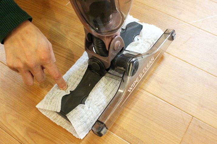 ワイパーシートの上にヘッドを載せ、ヘッド上部のくぼみにシートを押し込むだけで準備完了。このシートの装着方法は、フローリングワイパーと同じです。シートはドライタイプ、ウェットタイプのどちらも装着可能