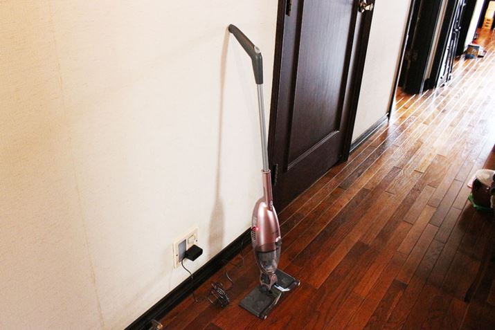 コードレスなので、掃除が終わったら充電しましょう。自立はしないので壁に立てかけておかねばなりませんが、重心が低いので簡単に倒れることはなさそう。バッテリー残量ゼロの状態から満充電まで約5時間かかります。連続運転時間は約10分と、比較的短め