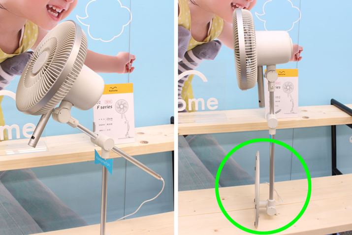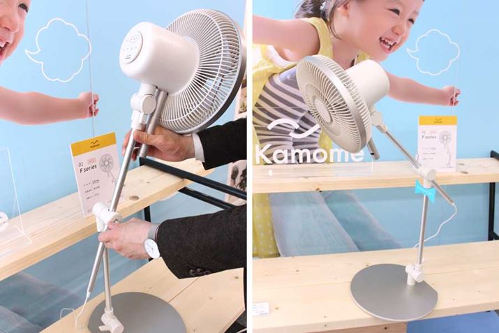今回発表された新モデル「Fseries」は、本体のアームをフレキシブルに伸縮させたり、プロペラ部分の向きを調整することが可能に。これは「正面から当たる風よりも、上から降り注ぐように浴びる風のほうが、気持ちよく感じる」ということに着目した仕様だそうで、シーンにあわせてさまざまな角度で送風できるようになりました。