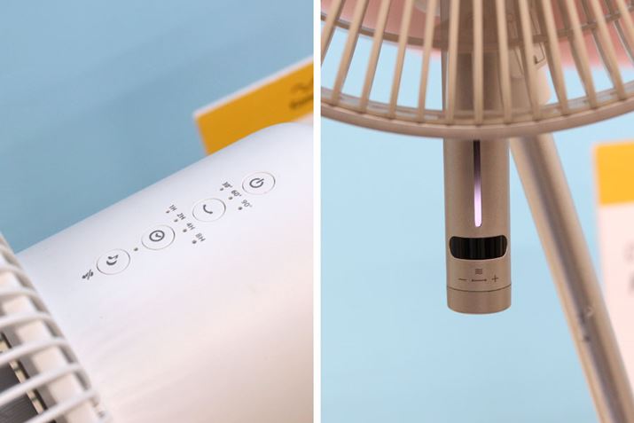 本体上部に、左右の首振り(30°/60°/90°)、入/切タイマー(1/2/4時間)などのボタンを装備(写真左)。風量調整用に、フロントにLEDインジケーター付きのツマミを搭載しています(写真右)