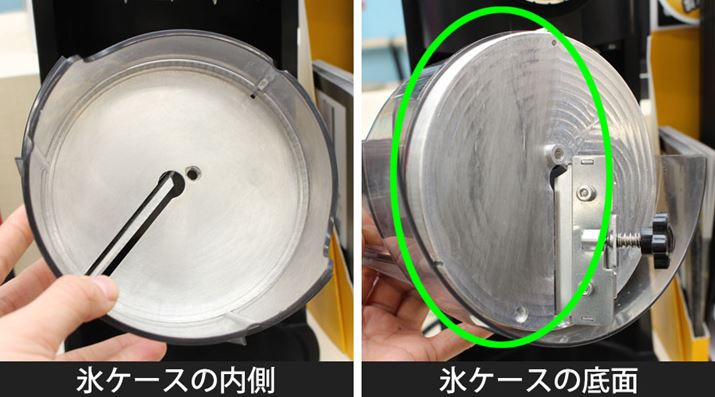 氷ケースをセットする台座の底面に、ヒーターを内蔵したアルミ合金の板を搭載しており、電源を入れるとこのヒーターが発熱します。その熱が氷ケースに伝わり、中の氷を温めながら電動で削っていく仕組み。