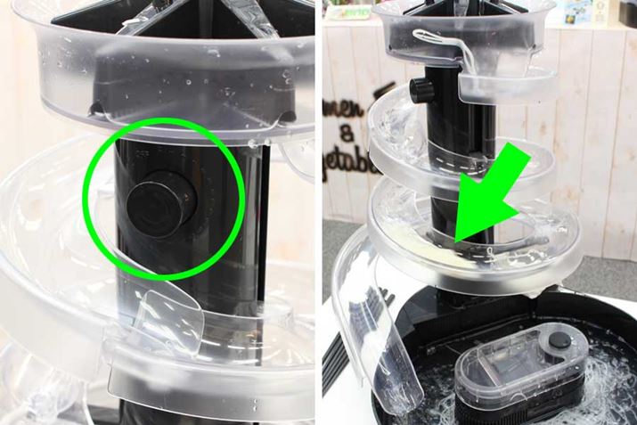 写真左に写っている黒いツマミで、水流のスピードを調節できます。写真右は、水流を早めてみたところ。結構な勢いで流れていくそうめんが、残像のように写っています
