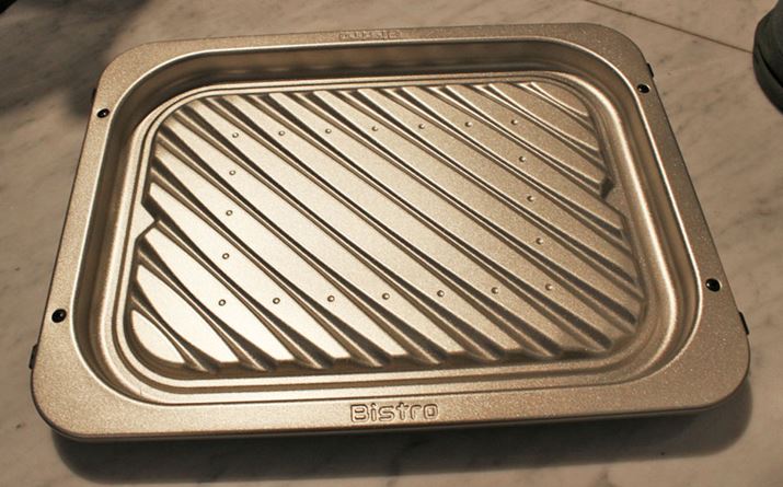 新モデルは高反射、高耐熱性を持つチタンをコーティングしたことで見た目も一変(従来は黒いグリル皿でした)。ゴールド調のグリル皿は、そのまま食卓に並べるのもアリだそうです