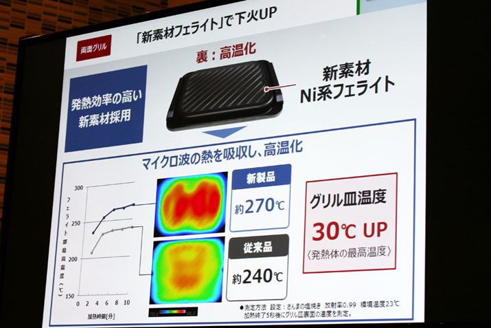 グリル皿裏面の素材を変更したことで、たとえば、さんまを焼いたあとのグリル皿裏面の温度は前モデルから30℃高い270℃に。新モデルのほうが食材の裏面がこんがり焼けそうですね