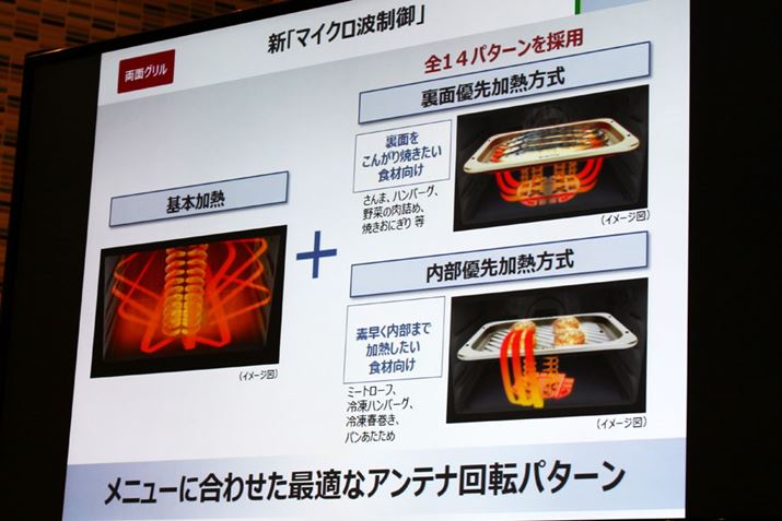 なお、従来から、多様なメニューに対応できるように、マイクロ波を放射するアンテナの回転パターンが14パターン用意されていますが、今回グリル皿の変更にともない、パターンをすべて見直し、最適化しているそう。メニューに合わせて電波の当て方を変えることで、魚やハンバーグなどはこんがり焼き色をつける、冷凍品や厚みのある食材は内部を優先して加熱するといったように下火の加熱具合を調整し、よりおいしく仕上げてくれます。