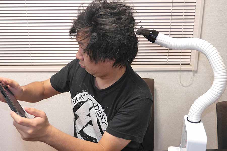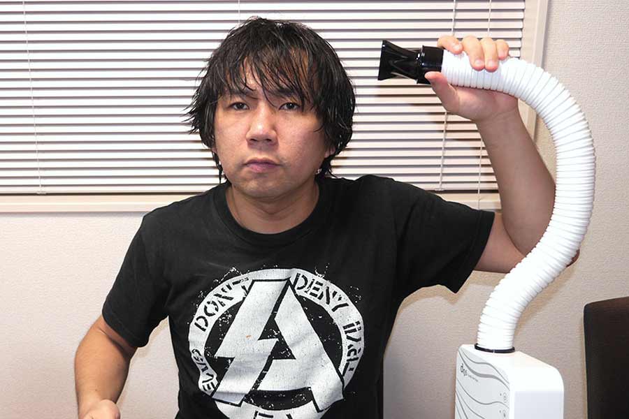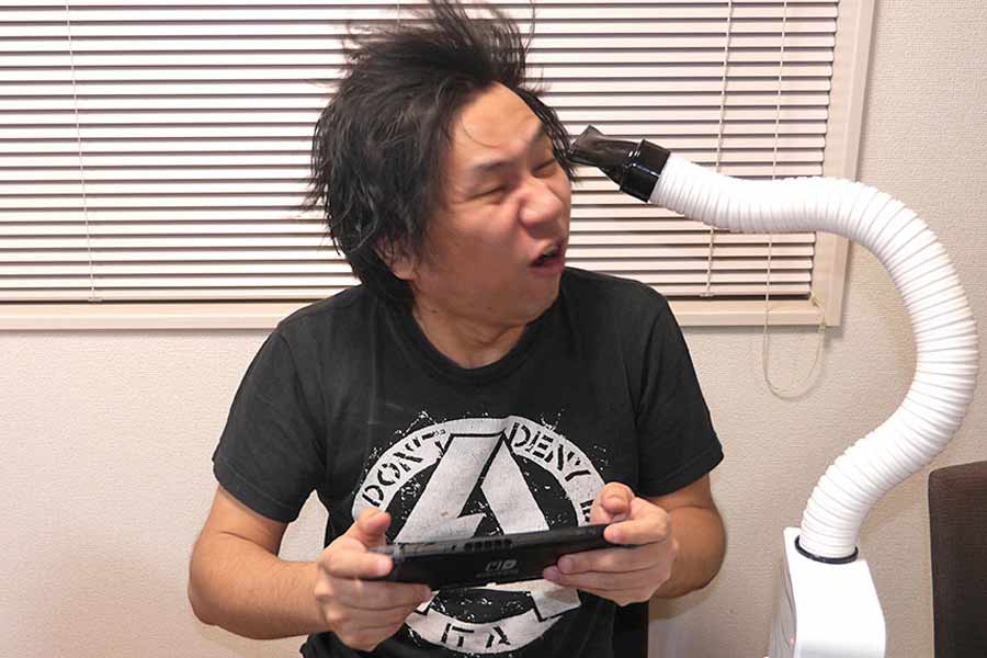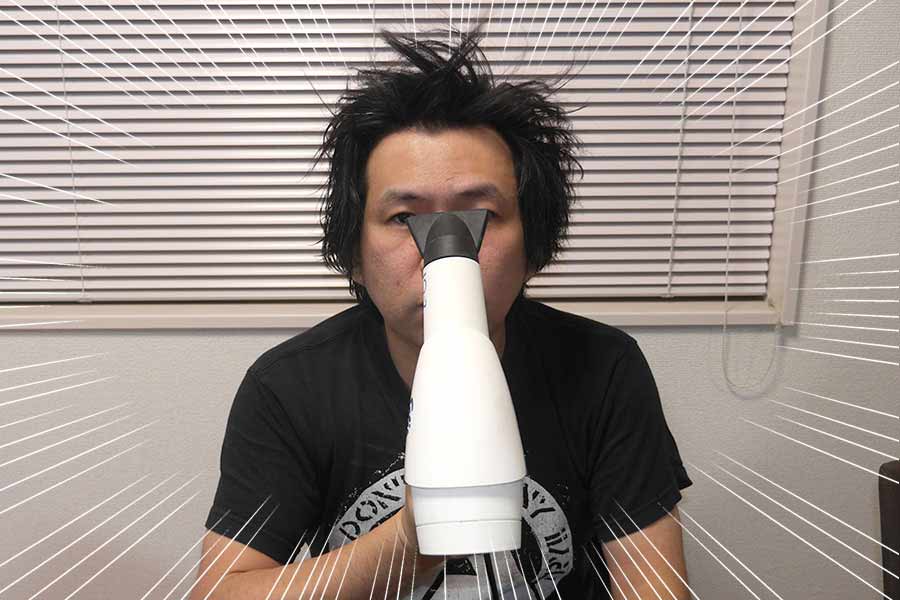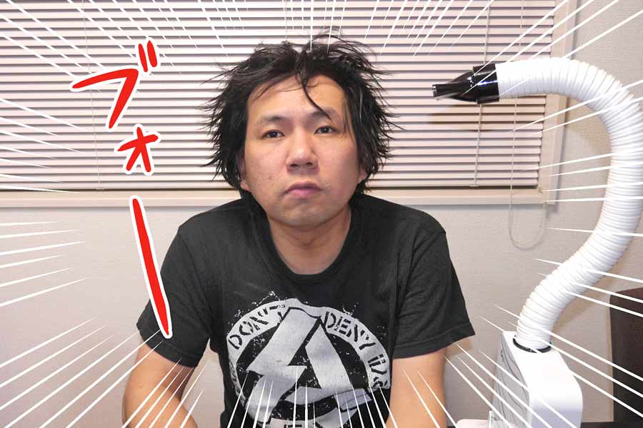 しかしこの「ハンズフリードライヤー」、気になるのが…ちょっと風が弱い! 普段使っているドライヤーと比べると、どうにもイキオイが足りない感じがします。