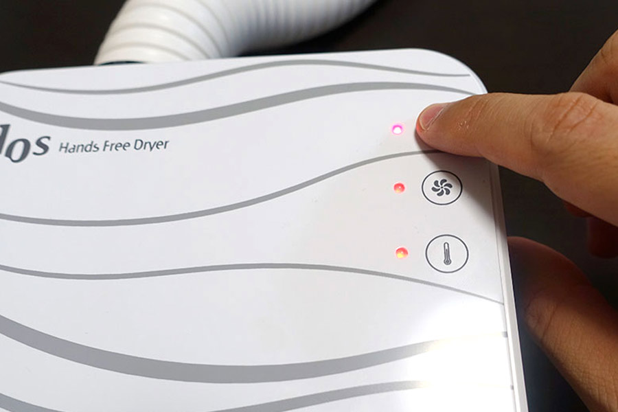 手持ちのドライヤーだと、普段3分くらいで髪全体を乾かせていますが(ボクくらいの髪の長さの場合)、ハンズフリードライヤーだと、途中、左右の場所を入れ換えてそれぞれ8分くらい…全部乾くまでに約16分はかかってしまいました。ちなみに30分たつと自動的に停止する仕様。