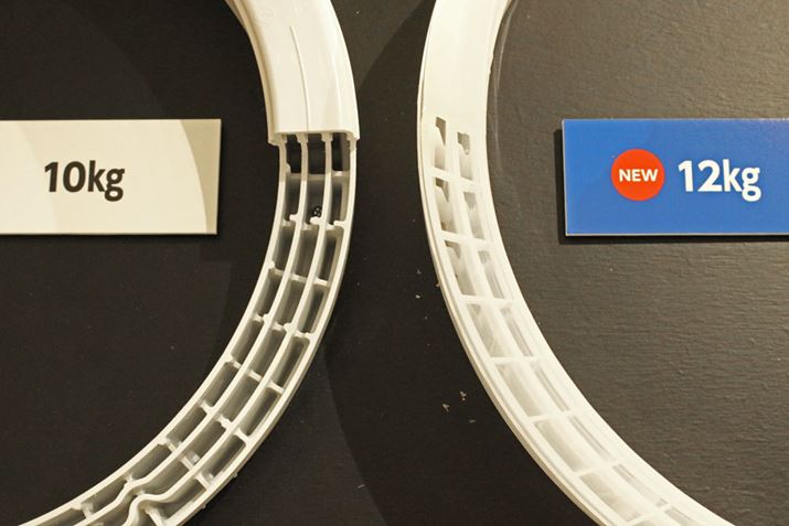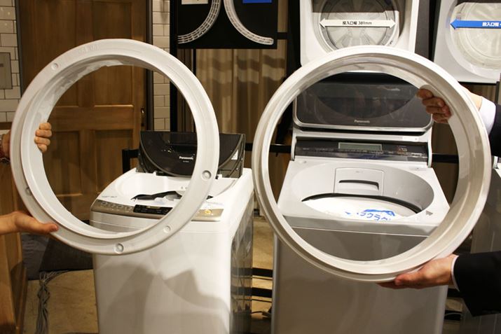 上の写真を見てわかるように、NA-FA120V1はこれまでの縦型洗濯機のイメージをガラリと変えるデザインが特徴的。近年の主流である直線的でシンプルなサニタリー空間にマッチするように、明度、彩度を抑えた高級感のあるカラーが採用されました。さらに見た目の美しさだけでなく、洗濯回数を削減できるように洗濯容量を従来の10kgから12kgに大幅アップ。あわせて投入口を円形の広い設計に改良することで、スムーズな洗濯物の出し入れを実現しました。このような広くて大きい投入口を実現する鍵となったのが、新開発のバランサー。洗濯槽上部に配置されるバランサーを薄型化することで、外観サイズを抑えながら容量や投入口を増大できたといいます。