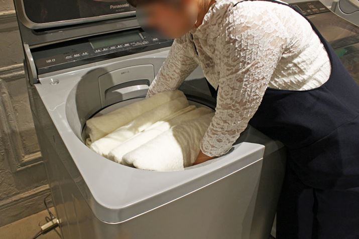 NA-FA120V1に搭載されている「毛布コース」は洗濯容量6kgまでとなりますが、薄手のシングル毛布(綿毛布1枚1.5kg以下)なら1回で4枚洗うことができます。その際も写真のように、簡単に毛布をセット可能。毛布を入れるネットも不要なので、わずらわしさもありません