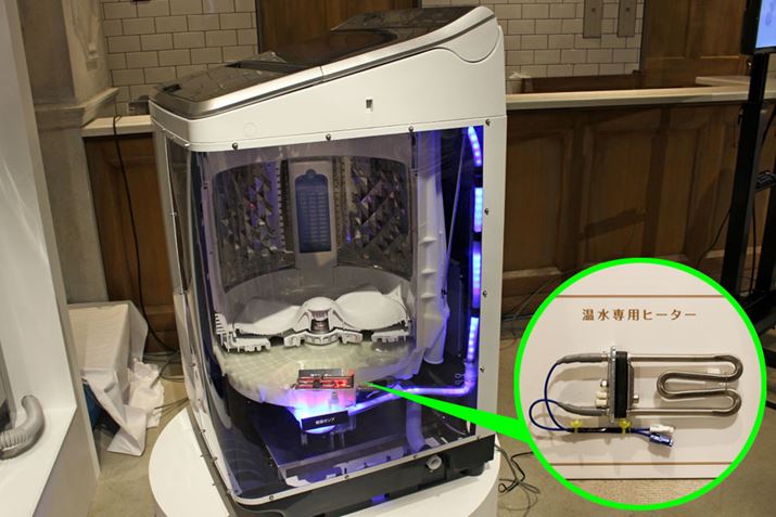 次は、進化した洗浄性能について見ていきましょう。パナソニックの洗濯機は、あらかじめ泡立てておいた洗剤液を給水と同時に洗濯槽に注ぎいれる「泡洗浄」が最近のトレンド。洗剤を泡の状態にしておくことで界面活性剤の効果を高め、汚れに素早くアタックできるというのが強みです。その泡洗浄が温水泡洗浄にグレードアップ。これまでは温風で洗剤液を温めていたため、乾燥機能を備えたモデルでしか温水洗浄が行えませんでしたが、洗剤液を温めるヒーターを装備することで乾燥機能のない縦型洗濯機でも温水泡洗浄が使えるようになりました。