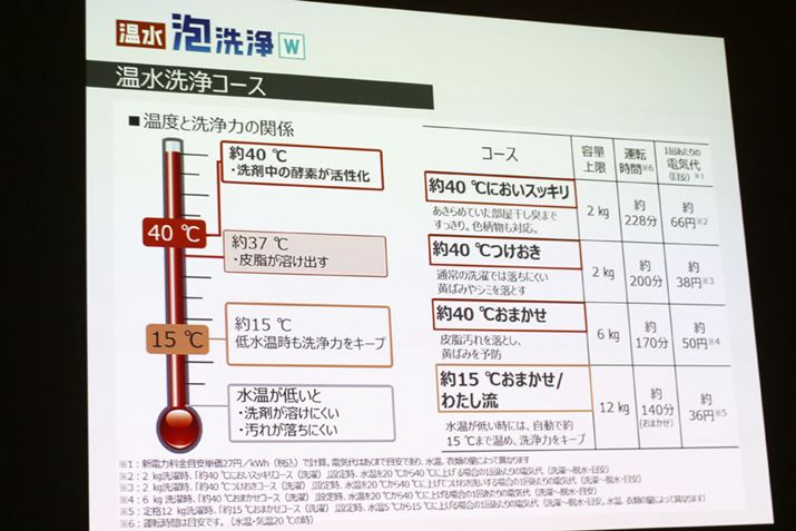 温水洗浄コースは4種類を用意。約40℃に洗剤液を温めると、衣類に付着した皮脂が溶け出し、洗剤中の酵素が活性化します。この温度帯で洗うと黄ばみ予防でき、約200分かけてじっくり洗うと黄ばみまで落とすことが可能に