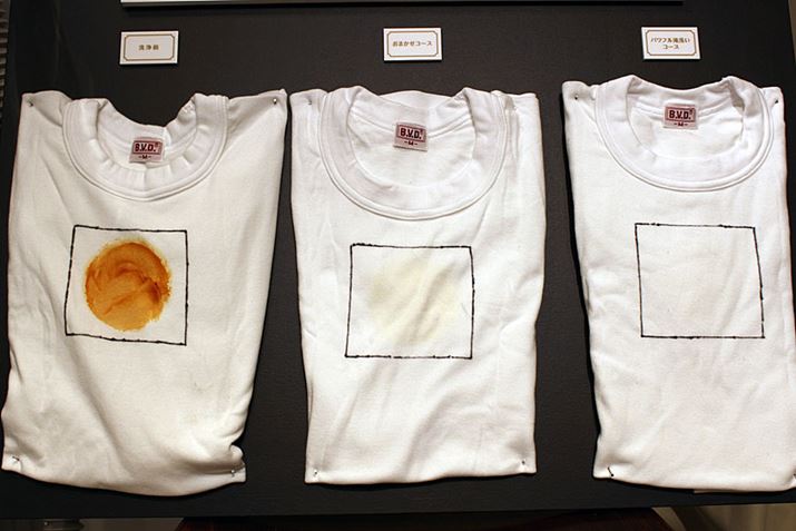 ケチャップのついたTシャツを「おまかせコース」で洗った場合、若干シミが残ってしまいますが(中央)、「パワフル滝洗いコース」で洗うと視認できないレベルまで汚れが落ちました(右)