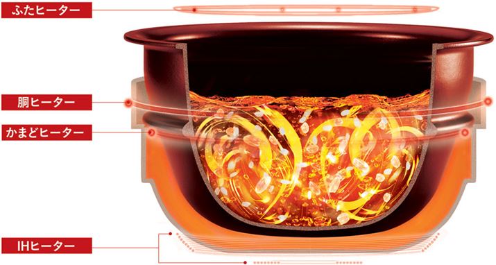 本体底、羽の部分、側面、フタの各部分に対応するヒーターで加熱するとともに、内釜が浮いていることでできた空間が空気断熱層となり、高い蓄熱と断熱効果を発揮。釜内から熱が外へ逃げるのを抑制します(「ふたヒーター」は、基本的に保温時に効果を発するヒーターとなります)