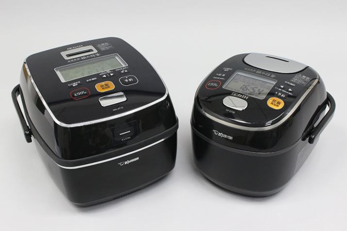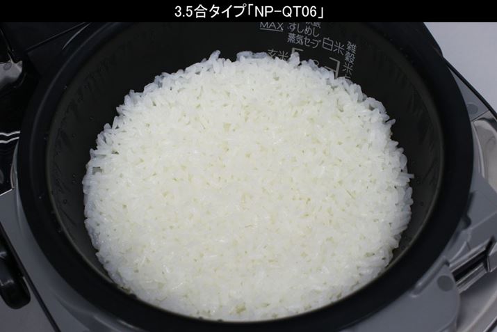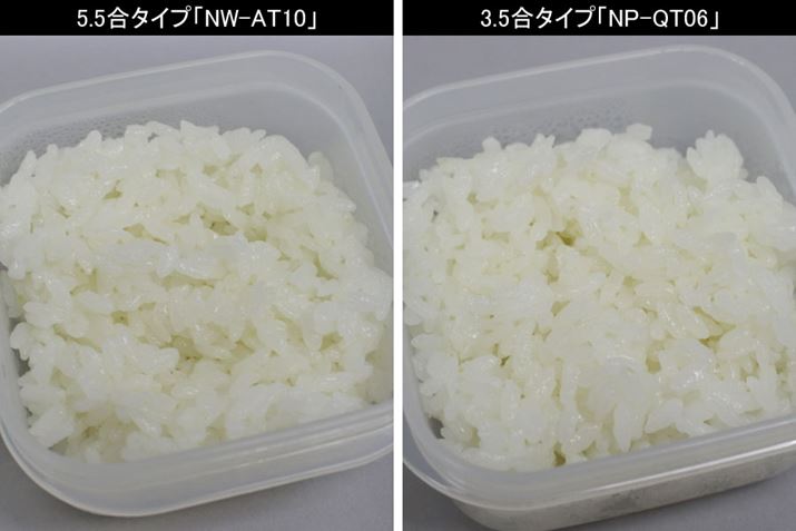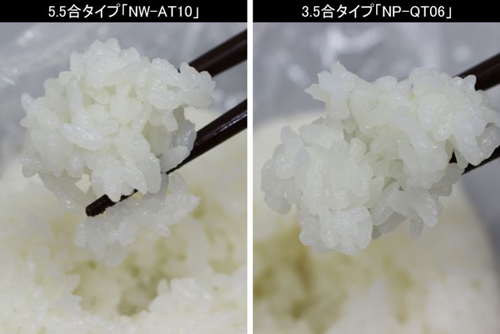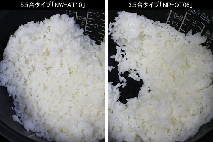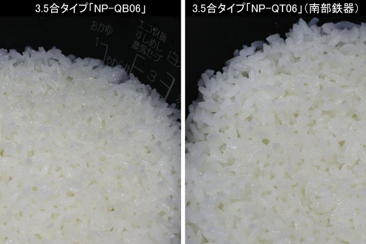 南部鉄器採用の3.5合炊き「NP-QT06」(右)と同じ炊飯容量の下位モデル「NP-QB06」(左)で、白米を炊き比べしてみました。炊飯時の消費電力はどちらも865Wです