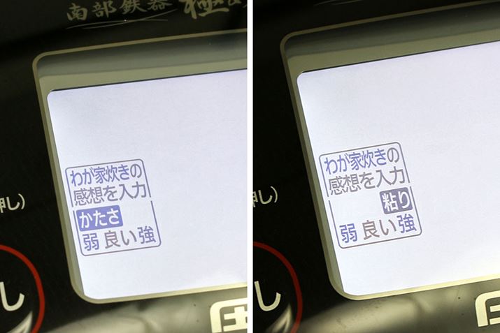 硬さと粘りをたずねられるので、3つの選択肢からチョイス。たとえば、硬さを「弱」、粘りを「弱」とした場合、次回「わが家炊き」メニューで炊くと、今回よりも「かためで、粘りが強い」ごはんになります