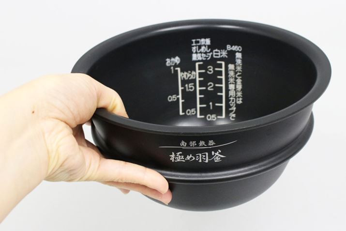 内釜の素材は違うものの、底がせまく、釜口に向けて広くなる形状は同じ。釜厚はNP-QB06(南部鉄器でない内釜)のほうが南部鉄器採用の「NP-QT06」よりも0.5mm厚い2.2mmですが、内釜自体の重さは約720gと軽量です(NP-QT06の内釜は約1.1kg)