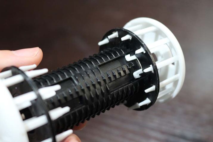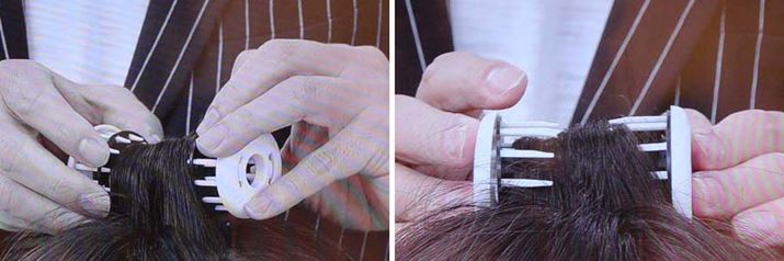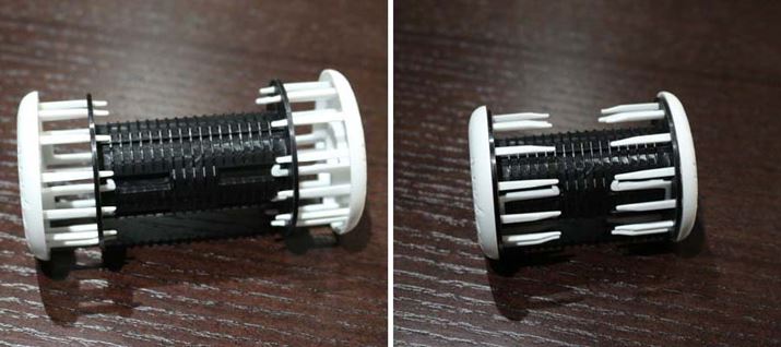 カーラーは、髪に巻きつける時は両サイドを引き出しておき(左)、巻き終わったら、両サイドを押して固定するだけ(右)。巻きから固定まで、ずっと両手を使えるので、初心者でも失敗が少ないそうです