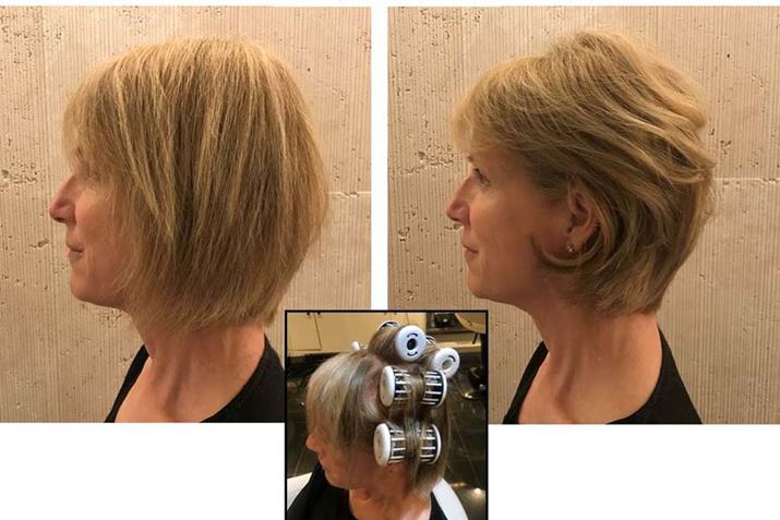 「ロックンローラー」を使用して髪をセットした前後を比較したもの。のっぺりとしたぺたんこヘアが、プロがブローしたような、ボリューム感のある美しい仕上がりに。ヘアスタイル以外は変わっていないのに、別人かというくらいエレガントな印象になりました