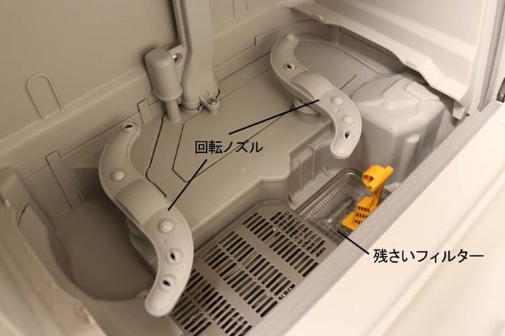 かごの下にある2つの回転ノズルから、ヒーターで温められた温水が噴射されて食器を洗う仕組み。手前にあるのは、洗い物から出たゴミを集める「残さいフィルター」です