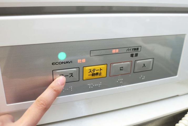 「標準コース」の場合は、「バイオパワー除菌運転」から乾燥まで、すべての工程が終わるのに94〜99分かかります。「スピーディーコース」は約59分(乾燥ありの場合)、低温ソフトは約145〜150分、乾燥のみは約60分。なお、各モード乾燥なしにも設定でき、「標準コース」「スピーディーコース」の場合は30分、低温ソフトの場合は60分時間を短縮できます。逆に、手洗い後に乾燥コースのみ使用することもできます。