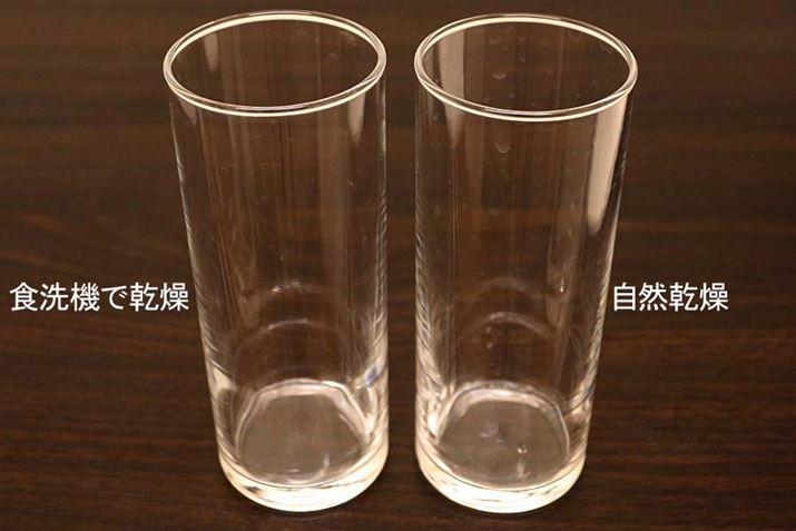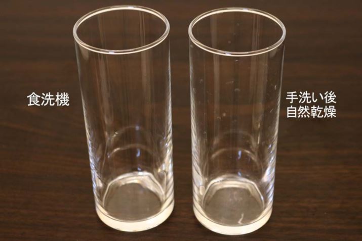 食洗機で洗ったグラスと、手洗い後に自然乾燥させたグラスを比較。手洗い後に自然乾燥させたグラスは、きれいなはずなのになんだか汚く見えます