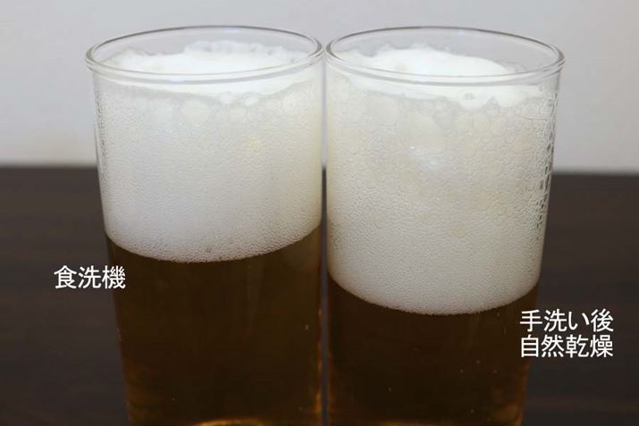 それぞれのグラスにビールをそそいで泡立ちを比較してみたところ、食洗機で洗ったグラスに注いだビールは、泡がより細かいような