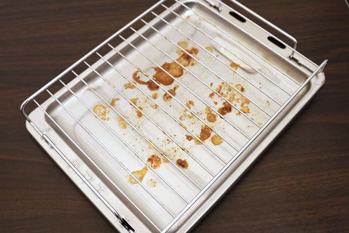 においやトレイに落ちた油はもちろん、焼き網の1本1本にこびりついた汚れを洗うのが非常に面倒なグリル。今回は、鶏肉を焼いた後の状態で試してみました。