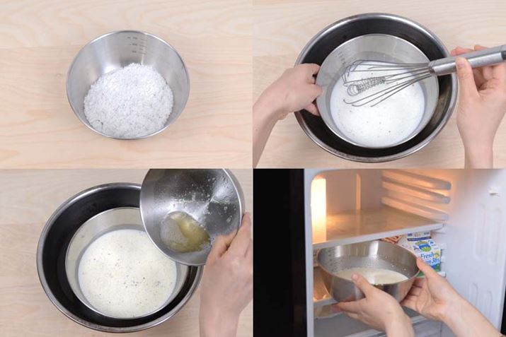 冷蔵庫で1〜2時間冷やしたソフトクリームミックスを蓄冷容器に流し込んだら、あとは天命を待つのみ