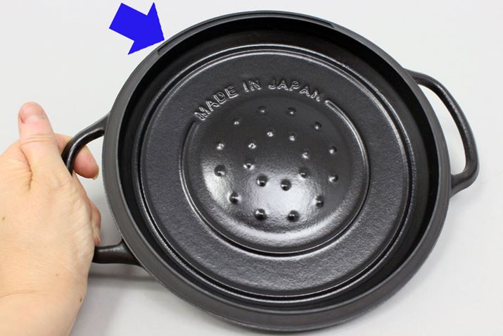 フタの中央にある突起は、食材から発生した蒸気を鍋に戻すための工夫。さらに、リング状の2つの輪は、デザインではなく、炊きあがったごはんのべちゃつきを抑えるためのものだそう。そして、矢印の部分にある溝は、密閉性を保ちながら蒸気を外に逃がす機構。高火力を維持しながら、吹きこぼれを抑制します