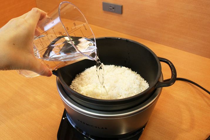 研ぎ方で差が出ないように、今回は無洗米を使用。一般的な炊飯器のように内釜に水位線はないので、専用のカップを使って必要な水を計量します