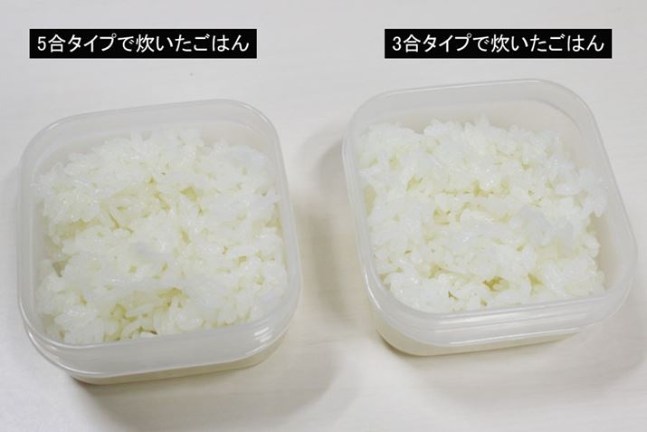容器にごはんを入れ、空調の効いた部屋に6時間放置。冷ましてから食べてみましたが、ウワサどおり、冷めても弾力、もちもち感、甘みたっぷりです。冷やごはんも、5合タイプ、3合タイプで味の差は感じず